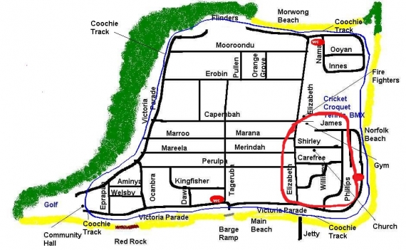 A map of Coochie Mudlo Island showing streets named after the Phillips family on the section owned by Bruce Brisbane Phillips, John's grandfather.