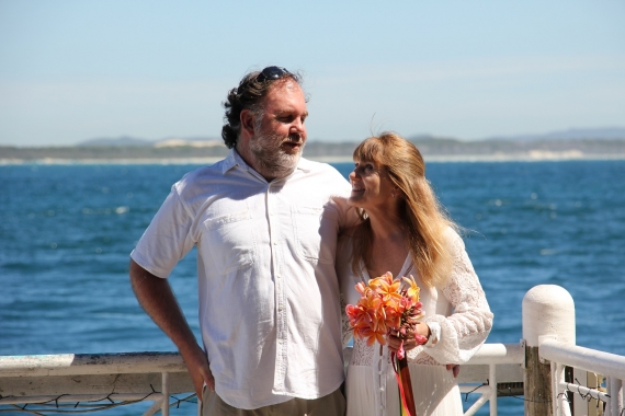 As his 50th birthday approached I started to wonder, what could I give my awesome man that would show him how much I loved and adored him and how grateful I was for all he had given us? It was a leap year, so I decided to ask him to marry me. I organized a surprise birthday party, calling as many of his old mates as I could locate. After the party they all went home, and I popped the question. To my relief, he said yes! Two weeks later, on Valentine’s Day, he presented me with a beautiful engagement ring. We discussed different wedding options from time to time but couldn’t seem to agree on how to get hitched. The wedding was put on the back burner. About a year later, tired of waiting for me, John went ahead and organized our wedding day. We had been going to Stradbroke Island for family holidays since the girls were little, so he booked accommodation on the island, contacted our closest friends, even bought me a beautiful dress. When everything was set, he told me the wedding would be in December. It was such a beautiful, relaxed day.